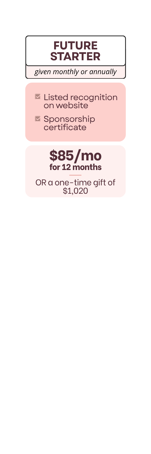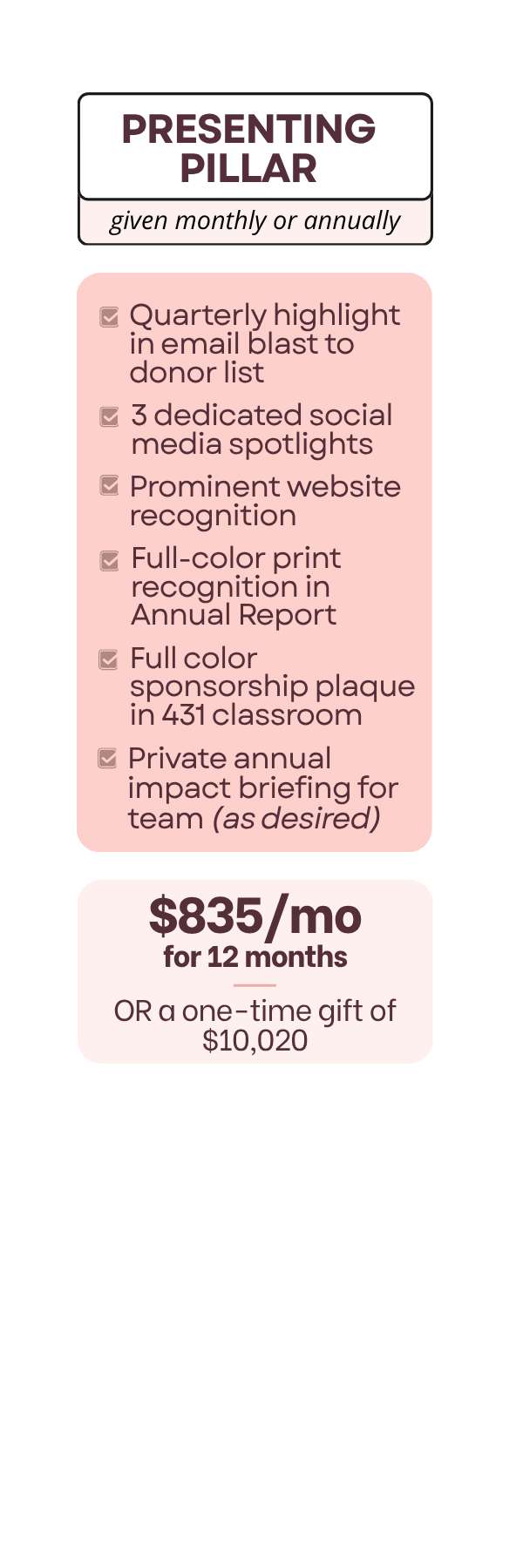 Each pillar option allows you to give a one-time gift or commit to a monthly gift for a year, as well as unique ways we thank your business publicly.