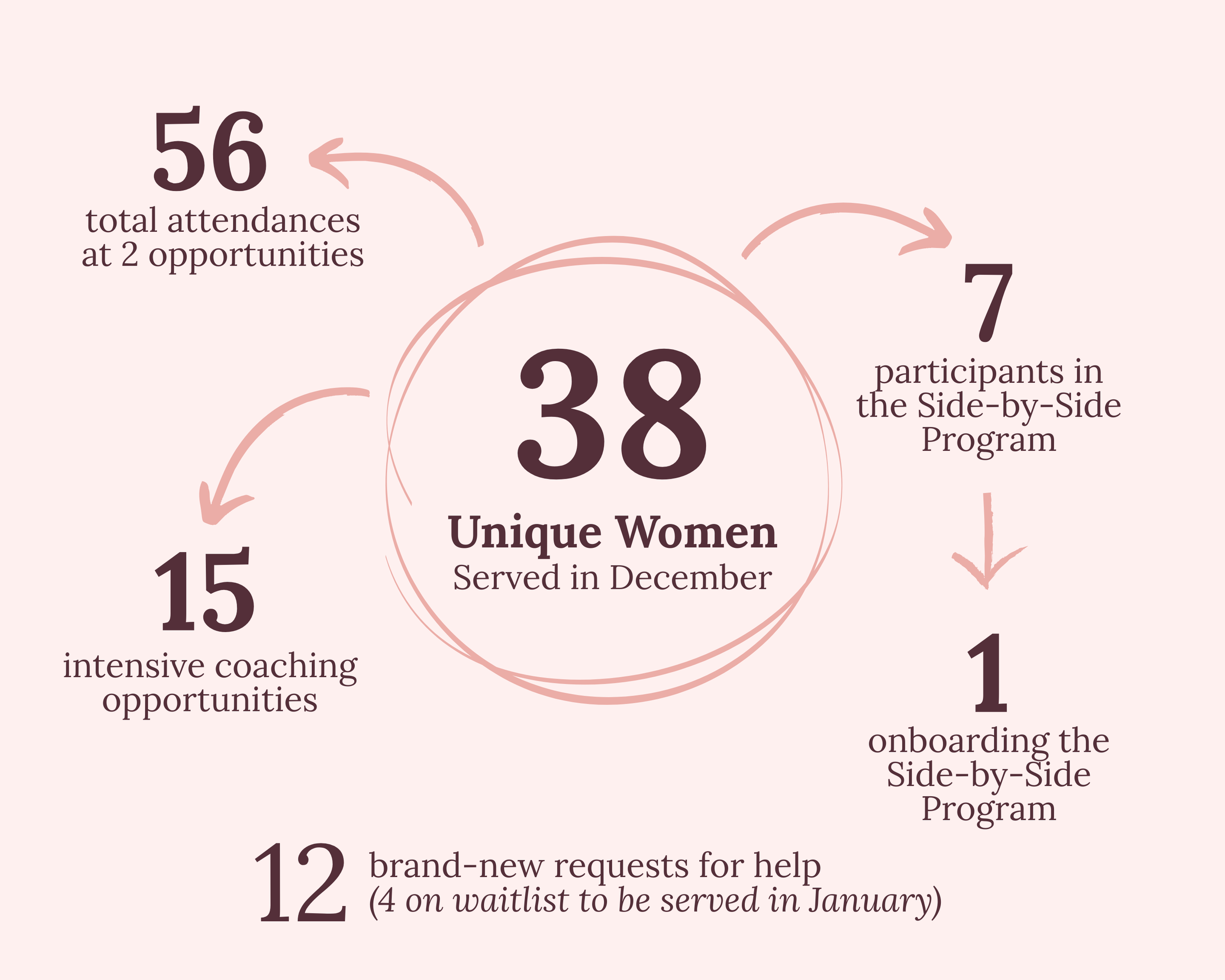 December finished strong with 38 unique women served, even despite the a shorter working timeframe, and smaller list of opportunities. (Only two compared to October’s seven!)